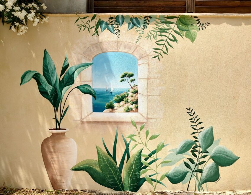 L’objectif de ce projet était d’embellir ce mur crépis aux abords d’une piscine pour créer de la profondeur et une ouverture sur…la mer !