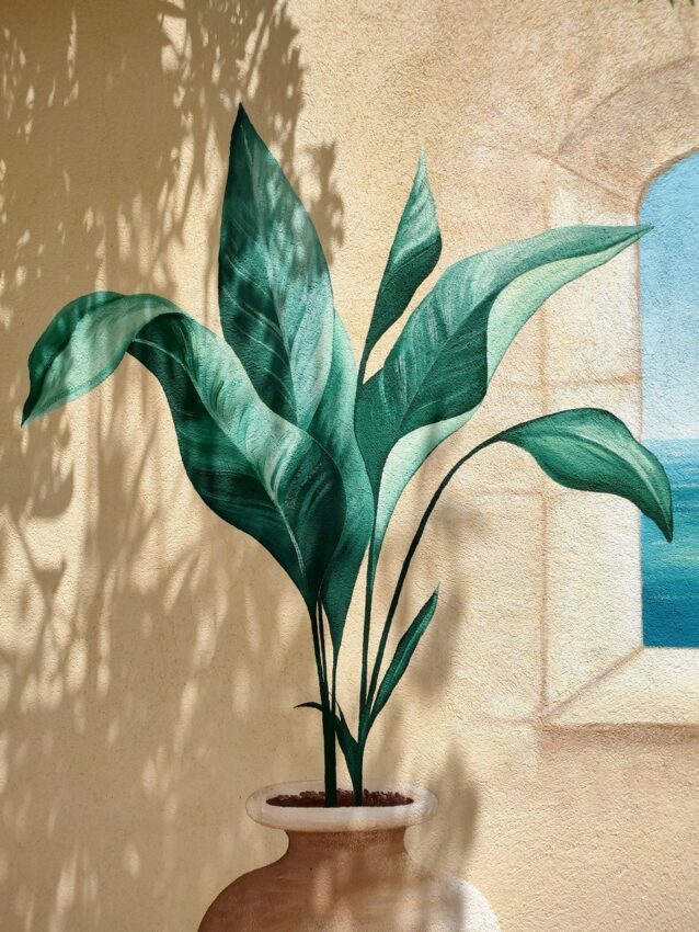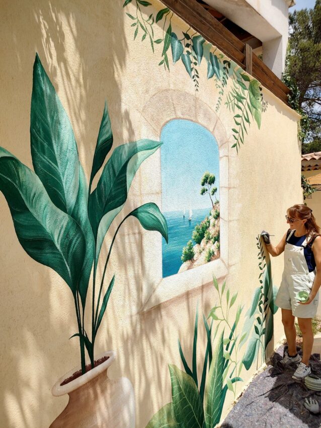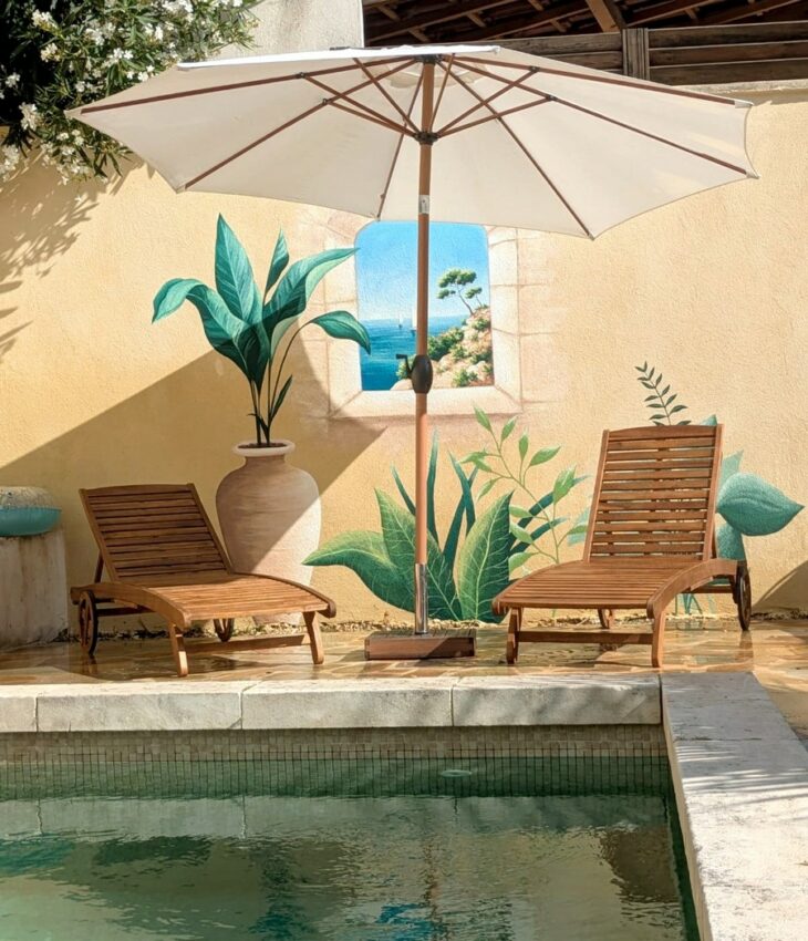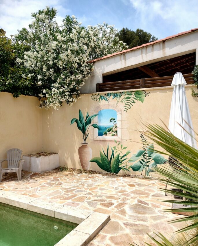 Mes clients voulaient profiter d’un décor plus élégant et plus immersif qu’un simple mur. Parfois, quand la terrasse n’est pas grande ou que l’espace piscine est entourée de quelques murs, la peinture murale offre une alternative très intéressante et la possibilité de végétaliser ou de transformer un espace.